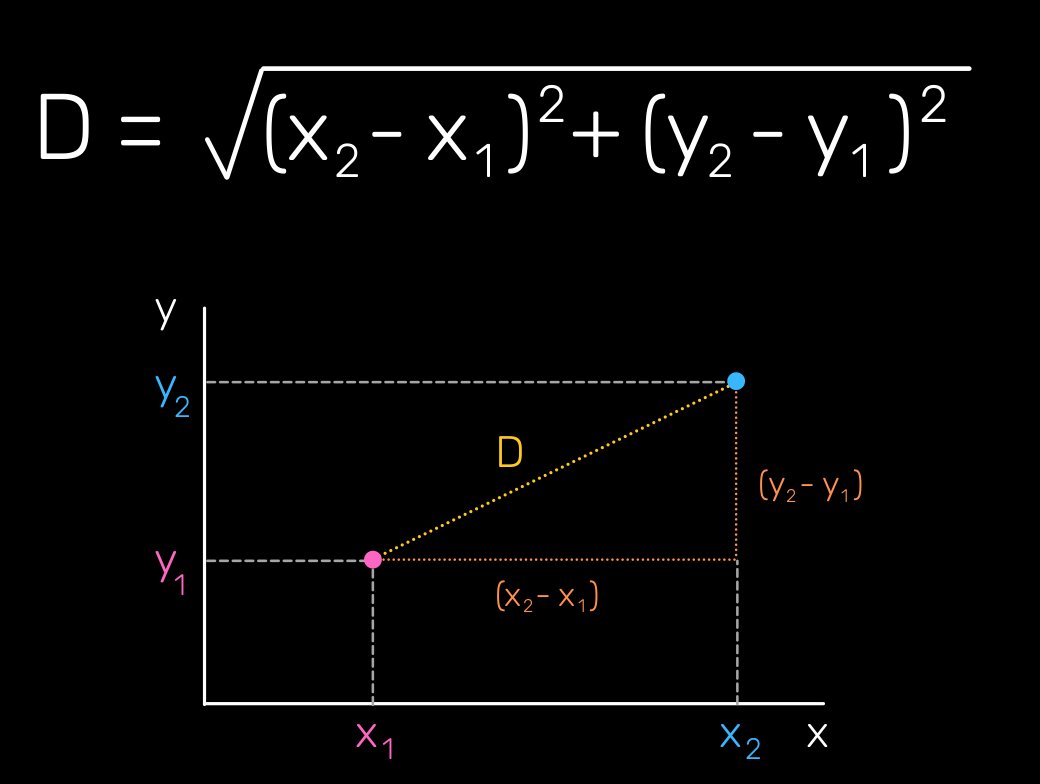 La fórmula de la distancia es una expresión algebraica utilizada para determinar la distancia entre dos puntos de coordenadas (x1 , y1 ) y (x2 , y2 ).